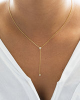 This dainty Y lariat necklace has 2 simple cubic zirconia pendants. The gold chain around the neck measures 8" while the drop adds an additional 2" in length. The length of the chain is adjustable and can be shortened to look like a choker lariat necklace.
