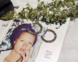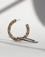 Large, thin flattened acetate hoop earrings with gray shell finish. Gray shell has a slight iridescent sheen in the sunlight. A-line edge with post backing.