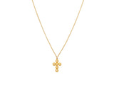 The small gold Fila Cross has an intricate open design and is embellished with small cz studs. This vintage-inspired charm hangs delicately on a gold filled curb chain.