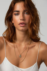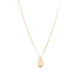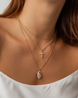 The Saint Mary pendant hangs freely on a 14K gold filled box chain.